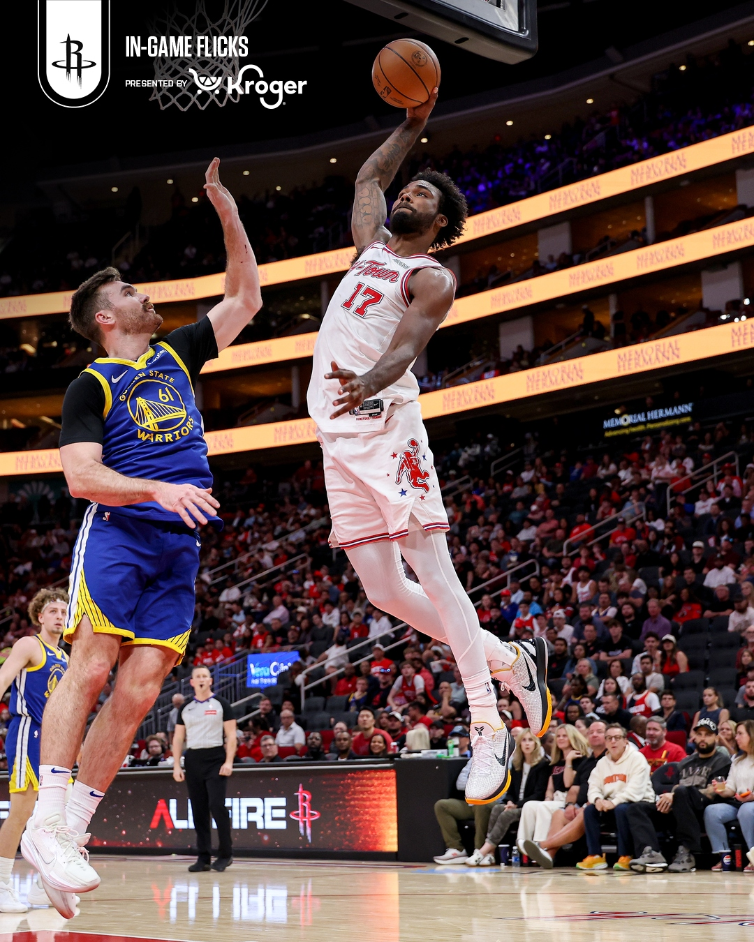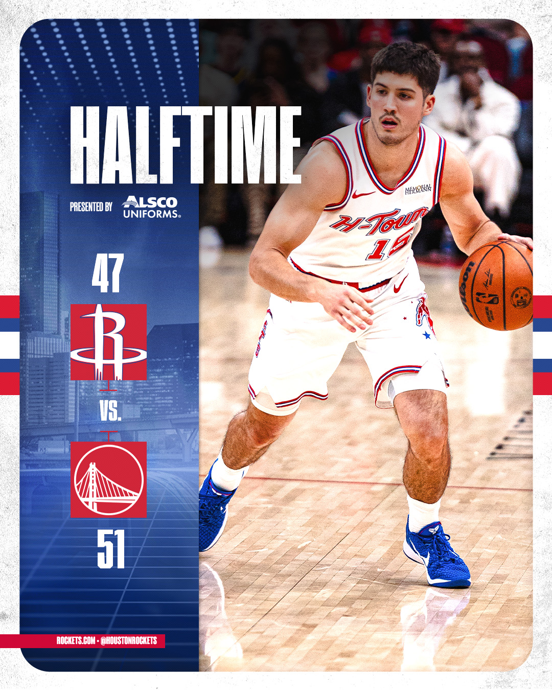 勇士队的波杰姆斯基得到26分和9个篮板,梅尔顿得到23分和6个篮板,霍福德得到17分、6个篮板和5次助攻,桑托斯得到14分、6个篮板和6次助攻,格林得到10分、5个篮板和8次助攻。火箭队的谢泼德得到30分和6次助攻,杜兰特得到23分和6个篮板,汤普森得到18分、10个篮板和5次助攻,申京得到17分、7个篮板和7次助攻,伊森得到9分和5个篮板,史密斯抢到11个篮板。
