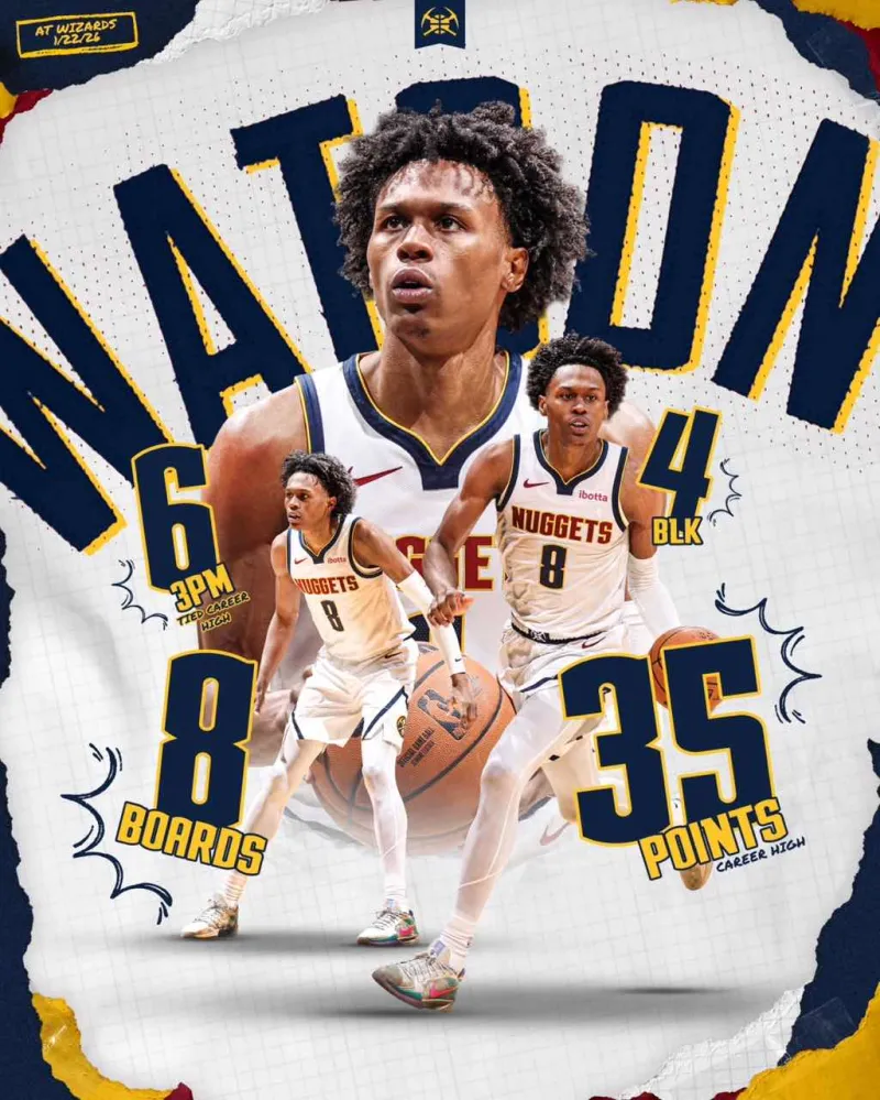 赛后,掘金官方分享沃特森本场比赛数据海报:他是佩顿-沃特森。